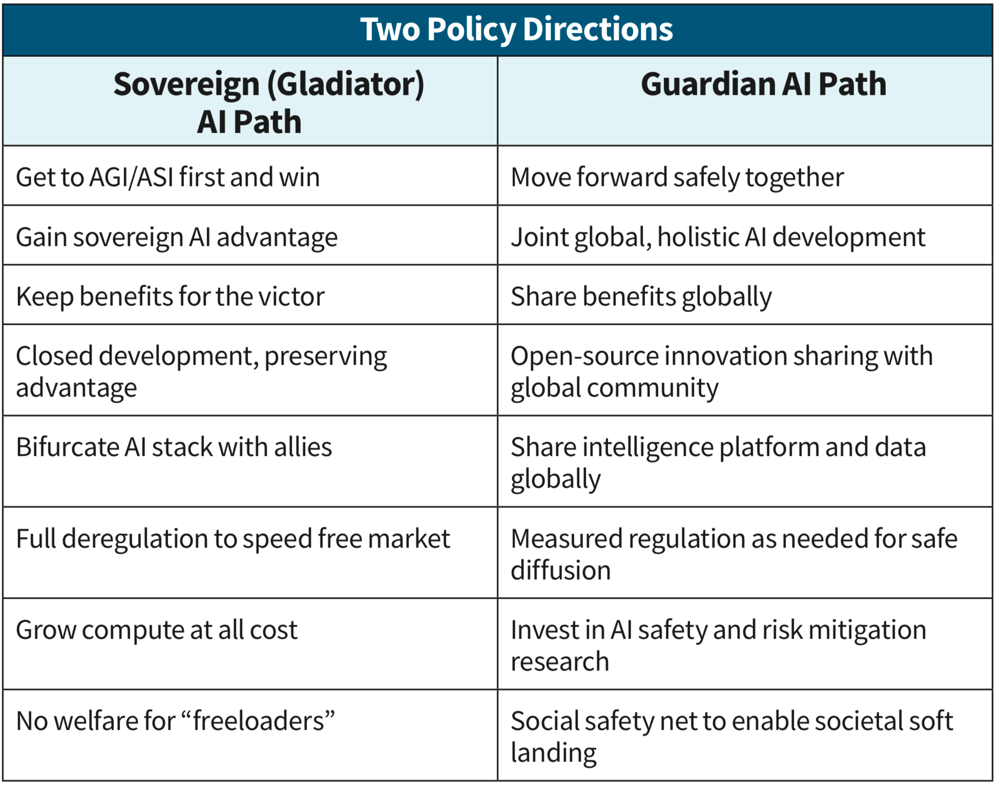 Two directions compete for policymaking today. The dominant policy narrative is focused on national advantage, and some experts advocate focusing on tool AI and sovereign AI to make the world safer. However, when objectively evaluating the risks, safety and prosperity lie in Guardian AI—smarter aligned systems that do not blindly obey us, but instead can preemptively protect us from threats we don’t yet see. To reach GAI, world leaders need to take a longer-term, holistic policy path to bring lasting benefits to their nation, and the world.