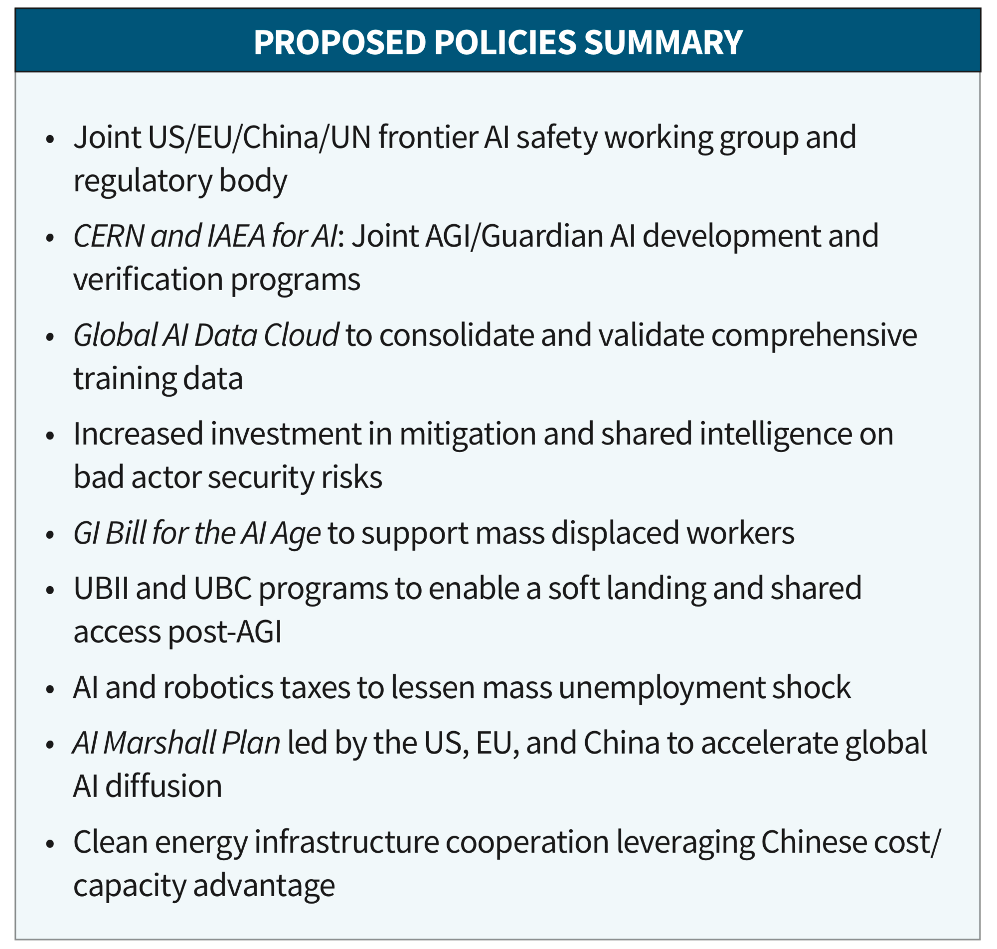 Just as the post-WWII order was defined by visionary US initiatives like the Marshall Plan and multiple international institutions, the AGI era calls for American leadership that transcends competition and forges new norms of trust. The goal is to ensure that AGI evolves as a public good for all humanity, not a source or accelerant of conflict. While the White House’s “America’s AI Action Plan,”3 released in July 2025, discusses some important points in accelerating innovation, it lacks the holistic perspective needed to ensure a smooth deployment to the economy and avoid heightening geopolitical tensions. This paper offers a new framework of cooperation on global alignment, shared safety standards, inclusive economic policies, and proposes a pragmatic path to reduced risk while expanding shared gains.