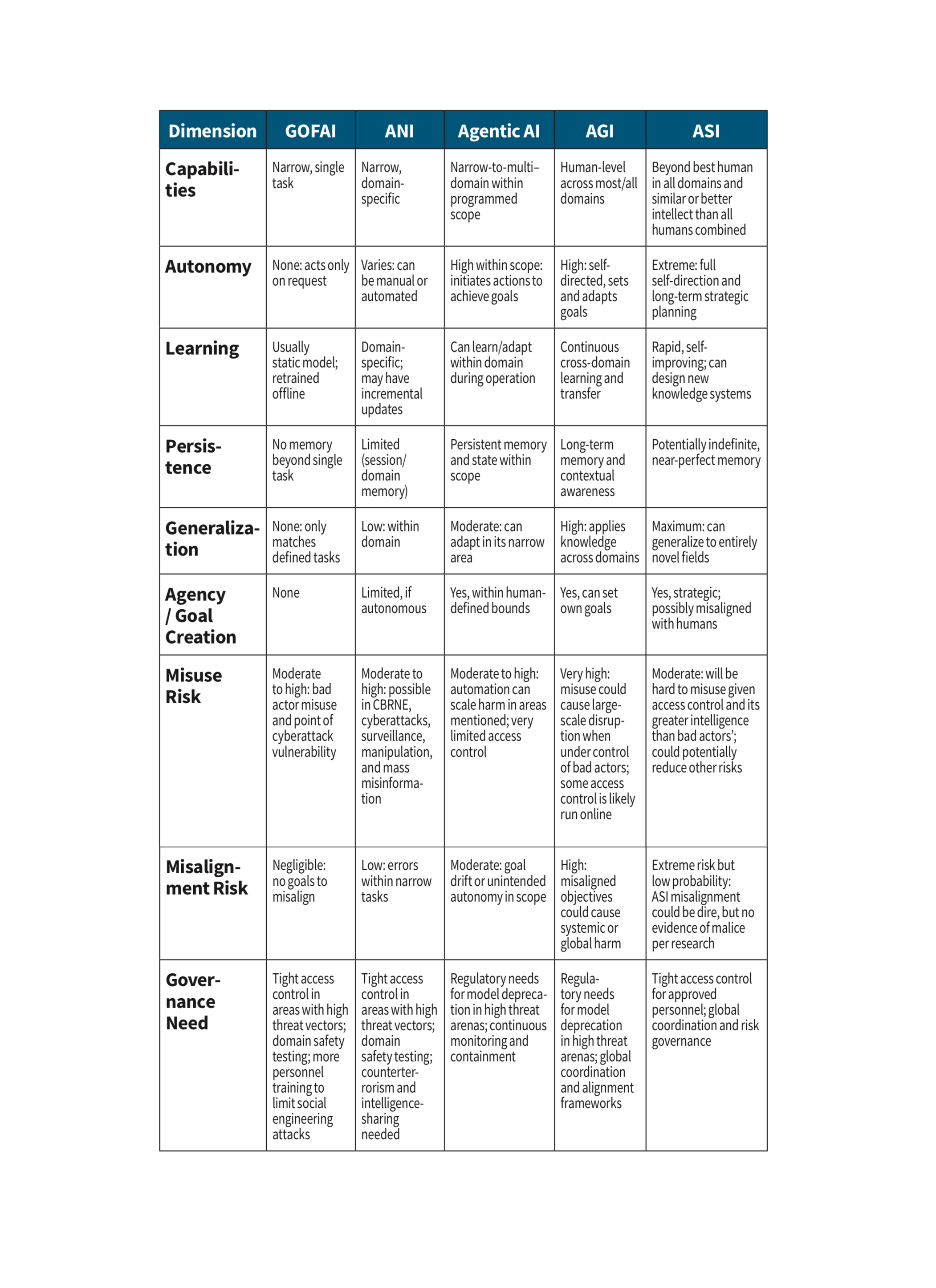 AGI usually refers to AI systems with humanequivalent cognitive abilities across a wide range of tasks—essentially, software that can learn or reason its way to solve novel problems and self-improve roughly as a human would. A successful implementation of AGI would mean that eventually, most cognitive labor could be replaced by machines. And when integrated with robotic systems and tool use, most manual human labor could also be displaced. This would lead to a complete restructuring of the global economy and our way of life. In the last couple of years, the concept of Agentic AI has risen in public awareness, which denotes the ability of AI systems to have a greater level of autonomy in completing complex tasks by responding to issues directly, and working in groups or using tools when necessary. Both ANI and AGI systems can possess agentic capabilities, but it’s not a requirement and doesn’t necessarily imply innate intent or self-directed agency. (There is much debate over the eventuality of AI and consciousness, but given the lack of scientific agreement on human and animal consciousness, this paper will not include further discussion on this topic.)